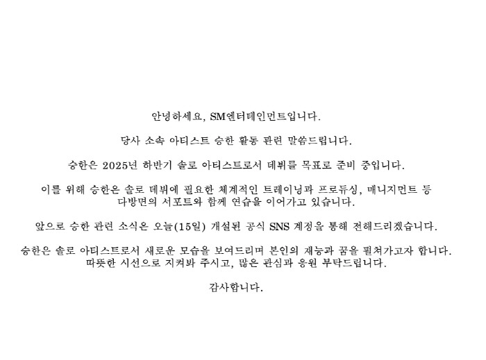 SM 측은 승한이 2025년 하반기에 솔로 아티스트로 데뷔할 예정이며, 이를 위해 전폭적인 지원을 아끼지 않겠다고 밝혔습니다. 팬들에게는 승한의 복귀를 응원해달라는 메시지를 전했습니다.